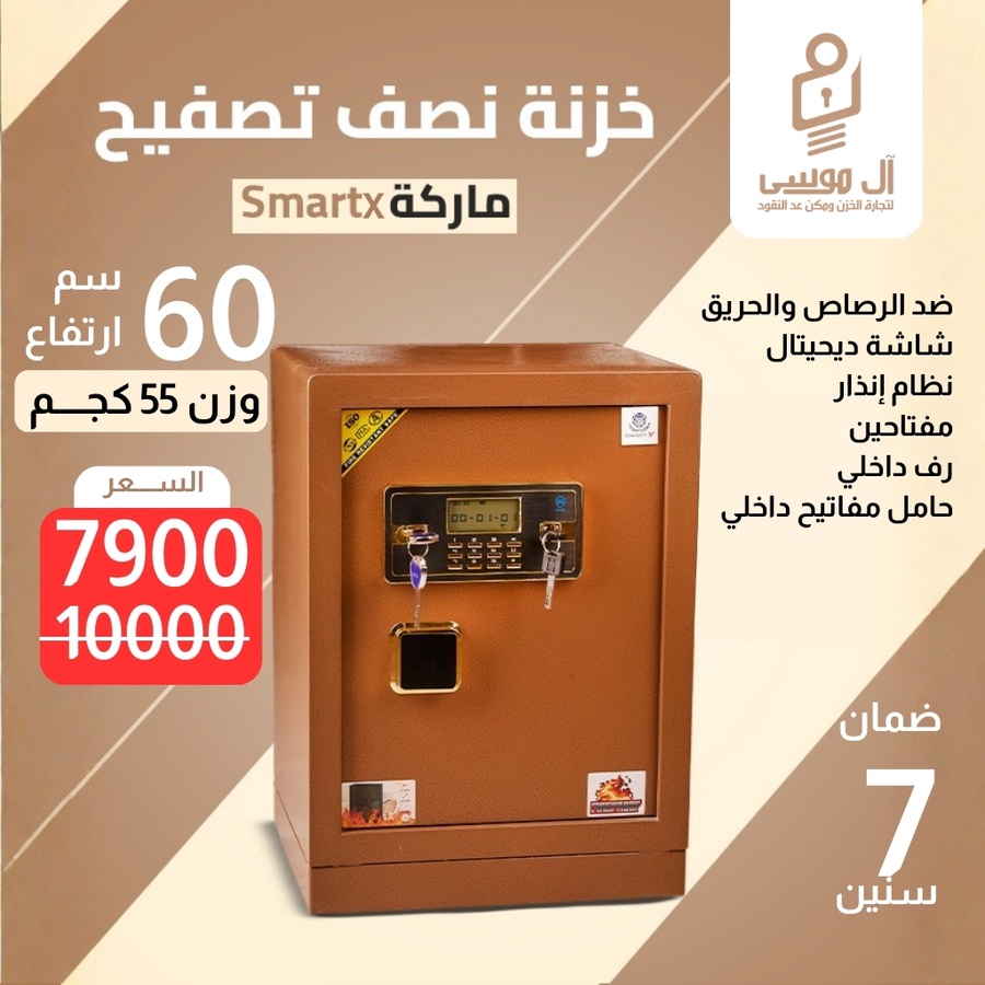خزن نصف تصفيح ماركة Smart ارتفاع 60 عرض 40 عمق 36 وزن 60 كجم.. جوانب مصفحة شاشة + ديجيتال ا 2 مفتاح - إنذار رف داخلي حامل مفاتيح داخلي